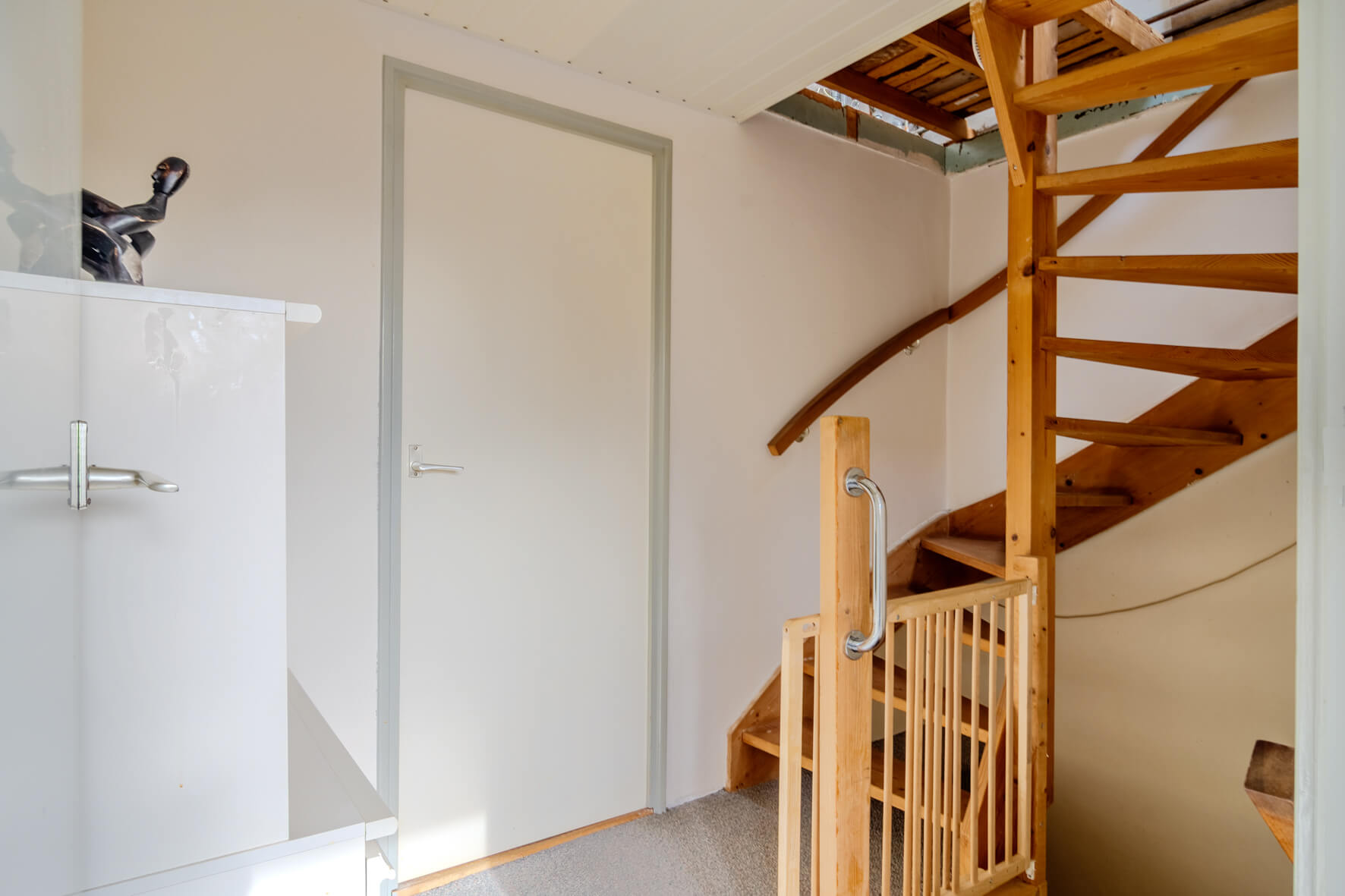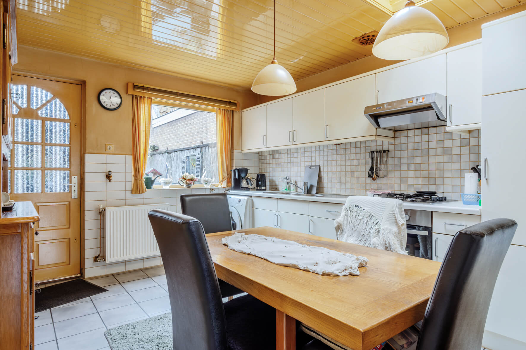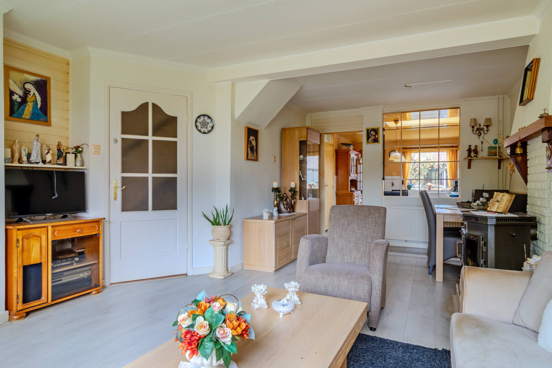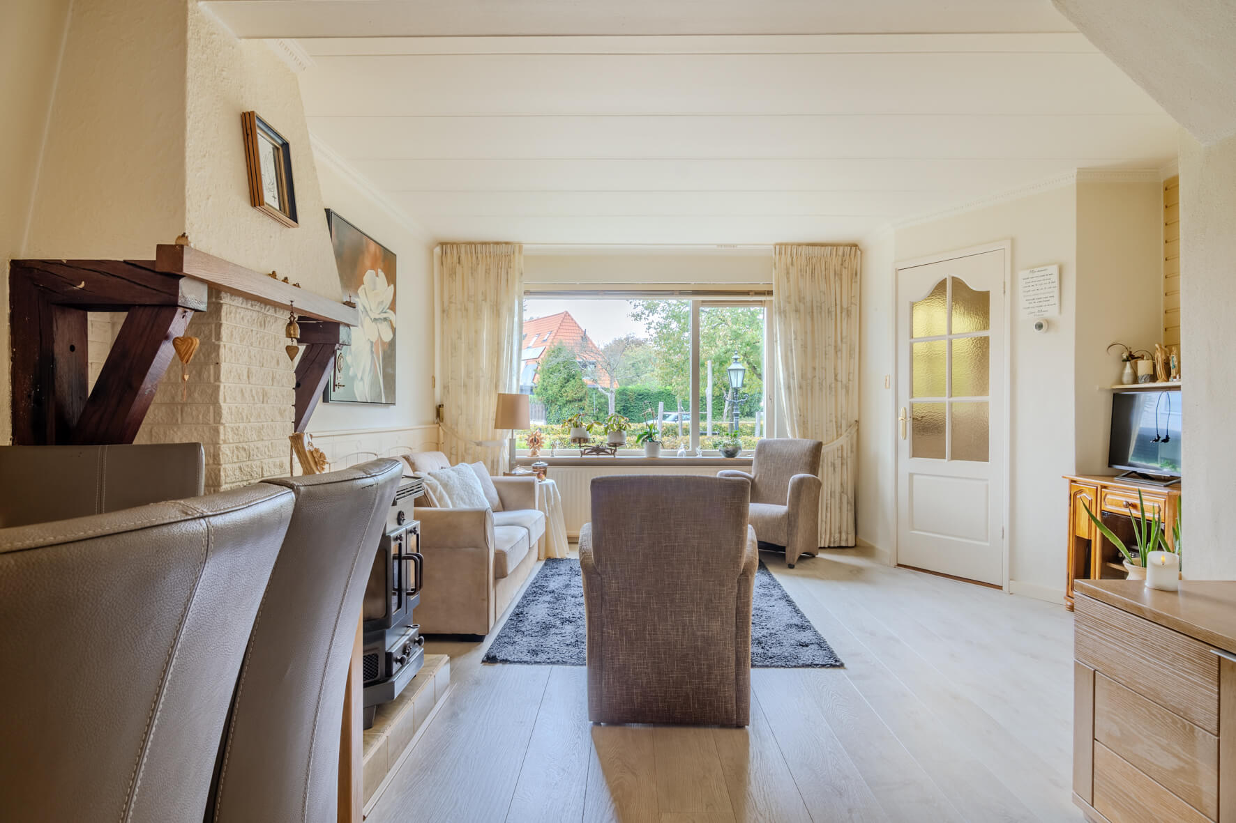 Via de verzorgde voortuin kom je binnen in de lichte woonkamer, waar de haard meteen zorgt voor een warme, huiselijke sfeer. De afgesloten trapopgang geeft de ruimte een prettige indeling. Aan de achterzijde is de woning uitgebouwd met een keuken voorzien van een lichtkoepel, waardoor er veel daglicht binnenvalt. De keuken is netjes onderhouden en uitgerust met diverse inbouwapparatuur. Vanuit hier bereik je ook het toilet en de douche. De begane grond is voorzien van een betonvloer.