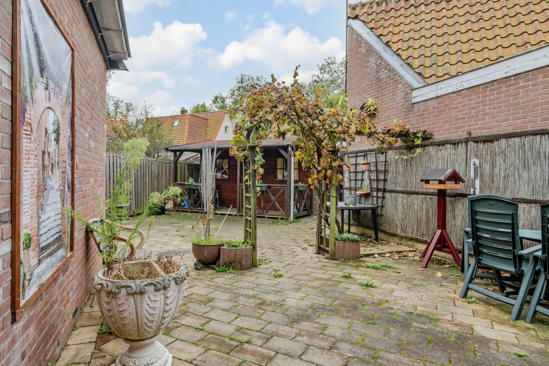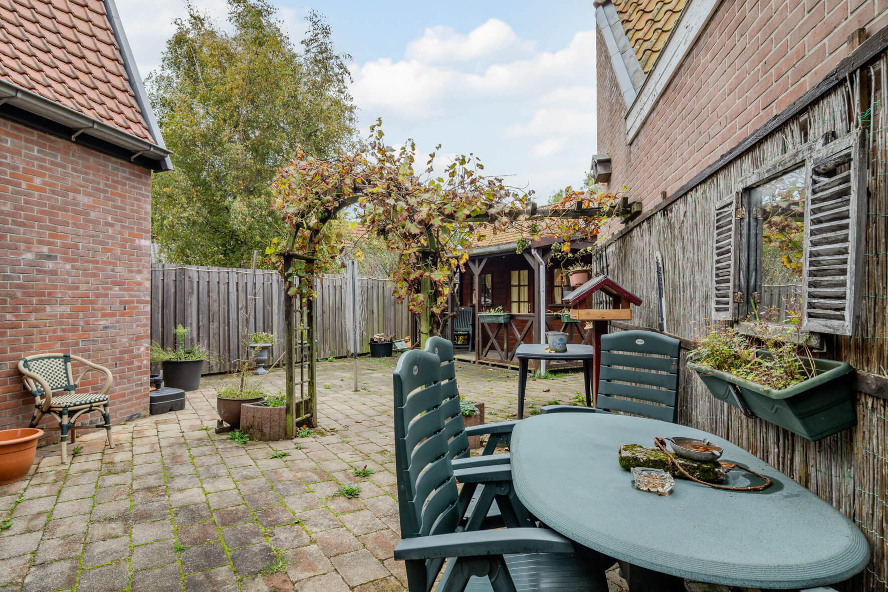 De woning staat op een ruim perceel met een diepe steeg aan de achterzijde. Een brede en handige doorgang naar de weg — ideaal voor het stallen van fietsen of om een eigen invulling aan te geven. De tuin zelf ligt heerlijk rustig en met volop privacy, perfect om van het buitenleven te genieten. Een grote blokhut in de tuin met veranda is ideaal voor het opslaan van alle tuinspullen.